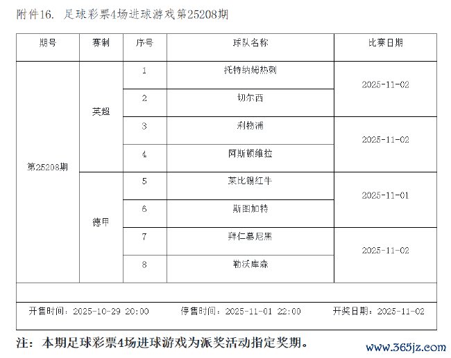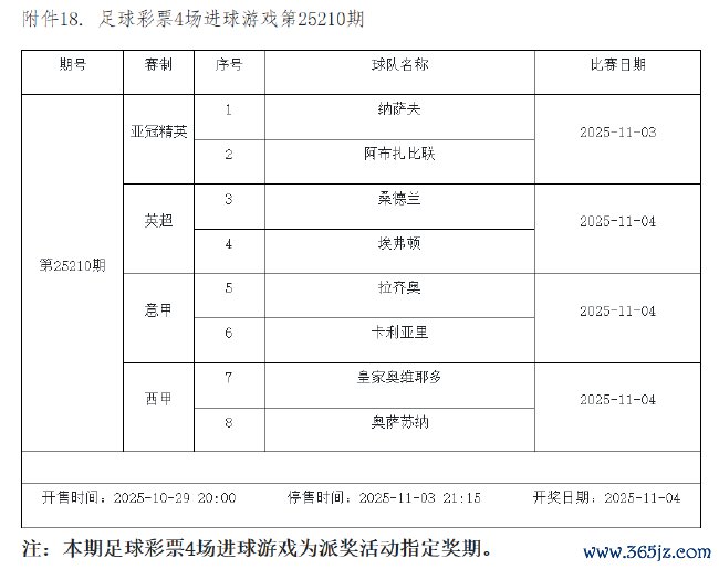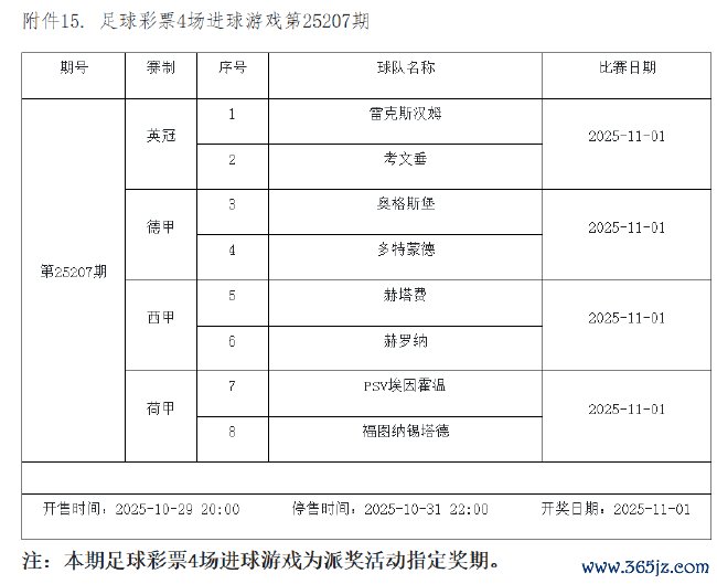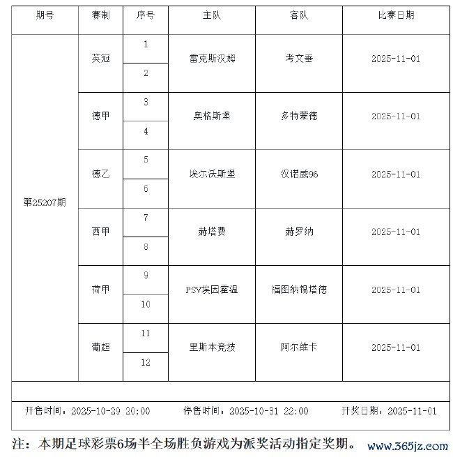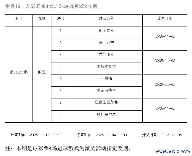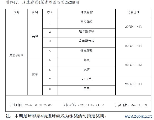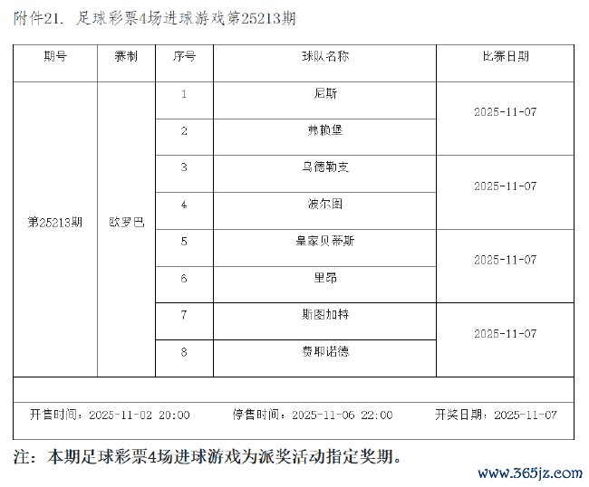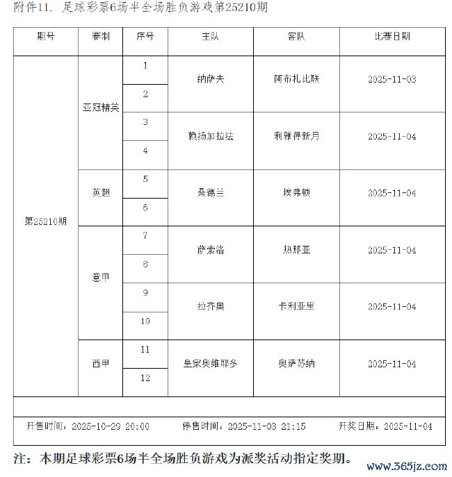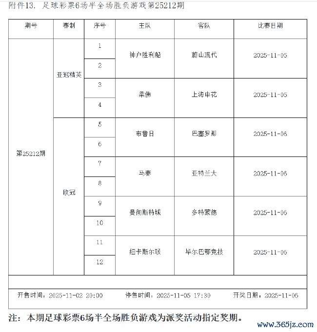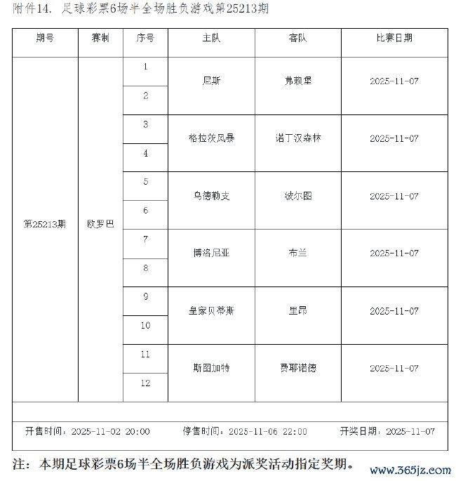 我中心制定了2025年中国足球彩票输赢游戏(14场、任选9场)、6场半全场输赢游戏和4场进球游戏10月31日-11月6日的竞猜场次安排(具体附后),其竞猜对象、开售技巧、停售技巧和计奖技巧均以本文为准。