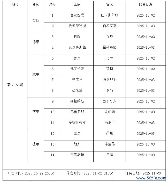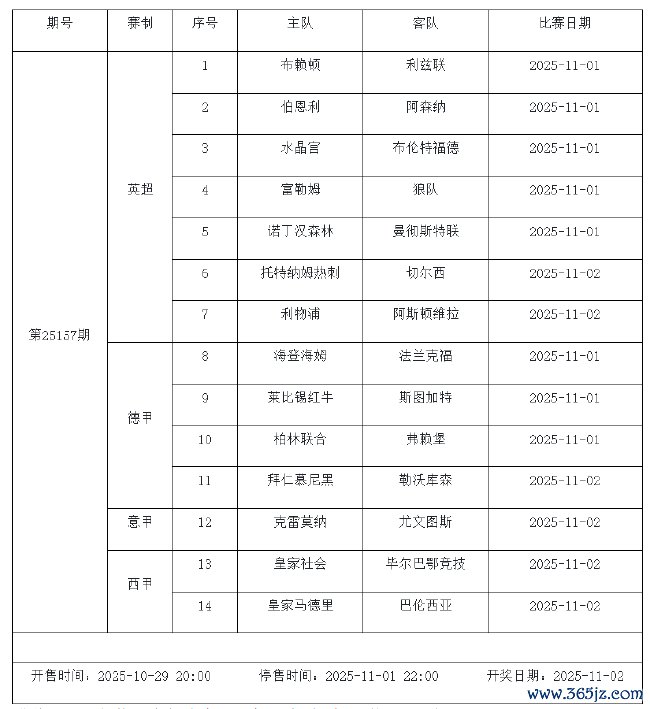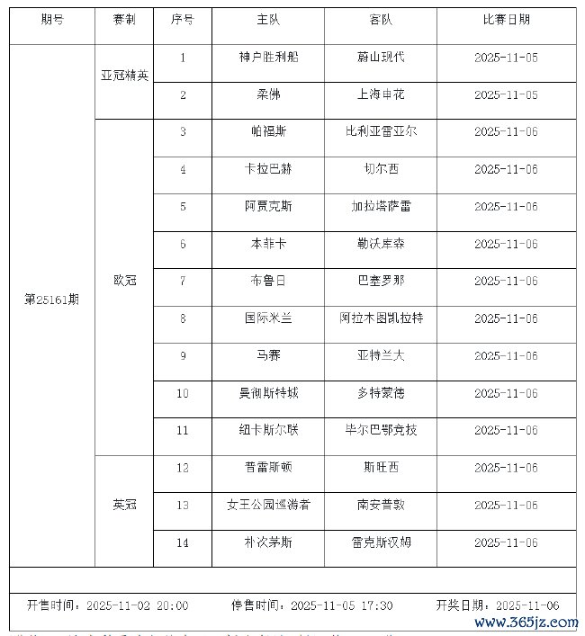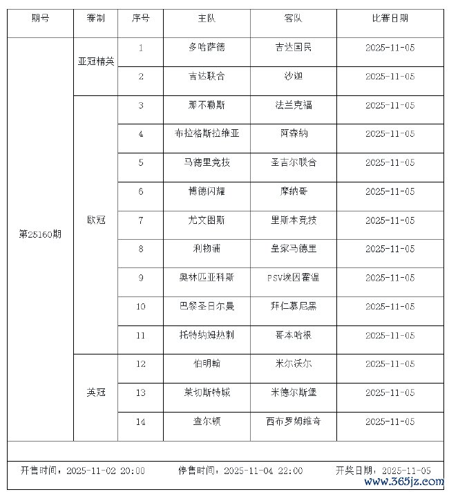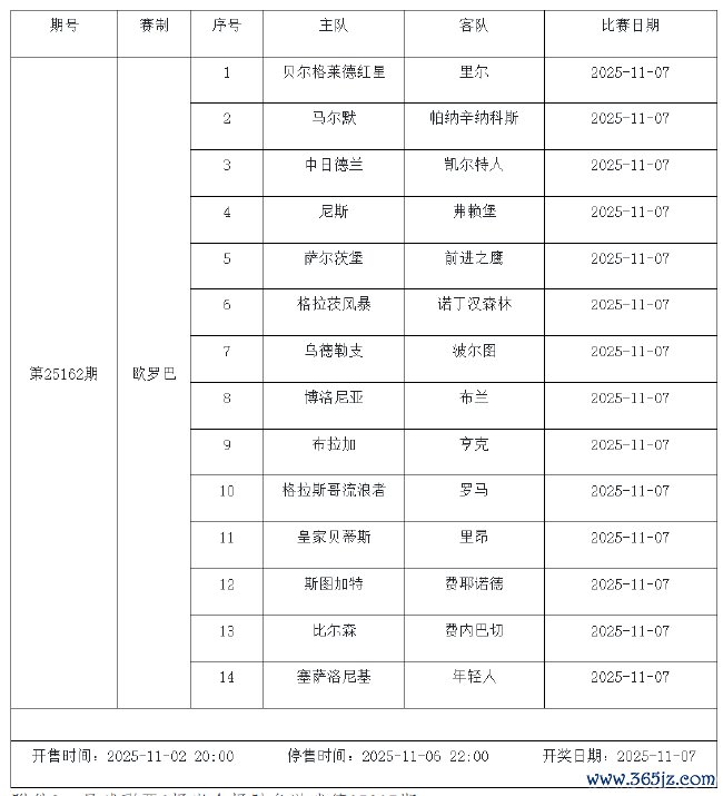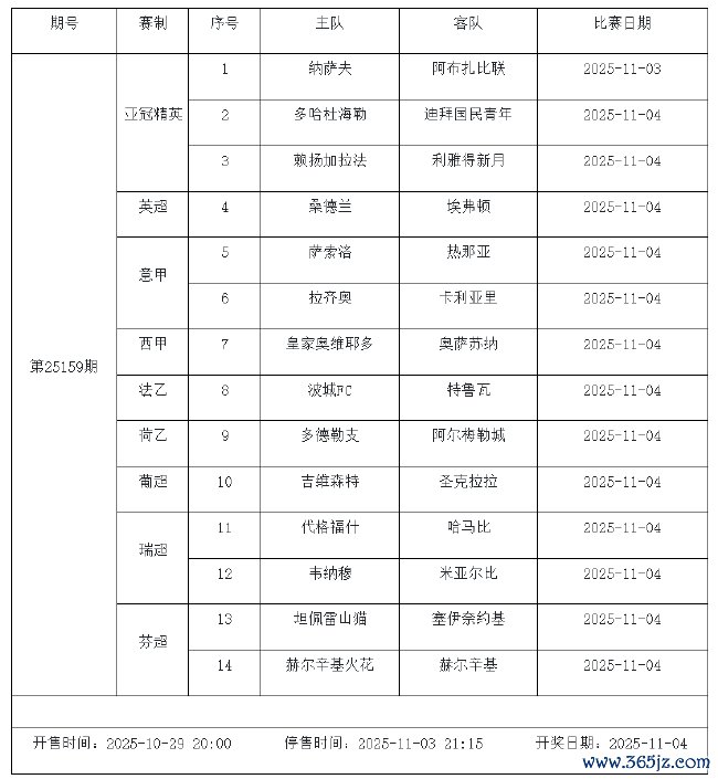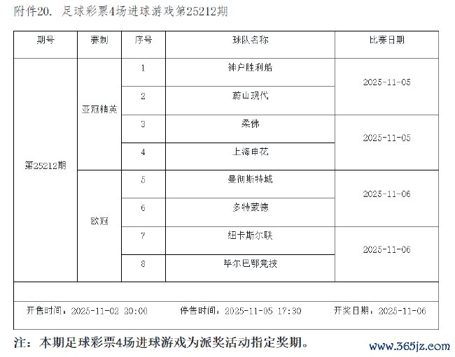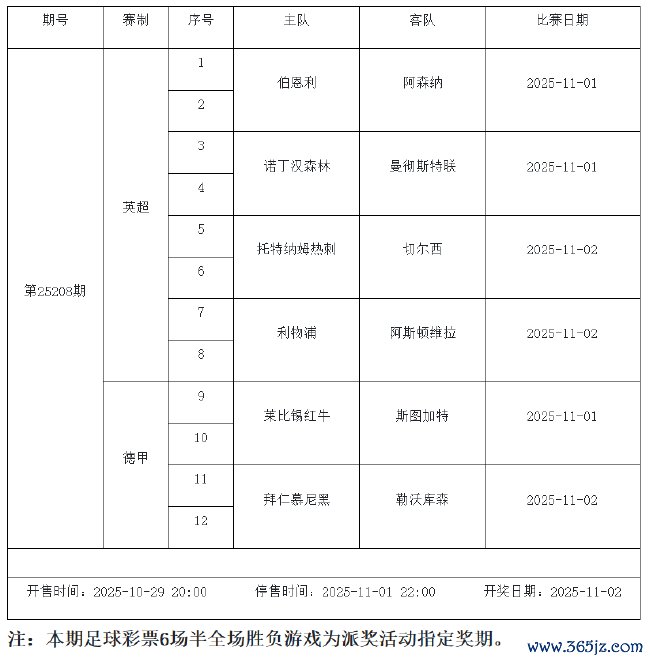 我中心制定了2025年中国足球彩票输赢游戏(14场、任选9场)、6场半全场输赢游戏和4场进球游戏10月31日-11月6日的竞猜场次安排(具体附后),其竞猜对象、开售技巧、停售技巧和计奖技巧均以本文为准。